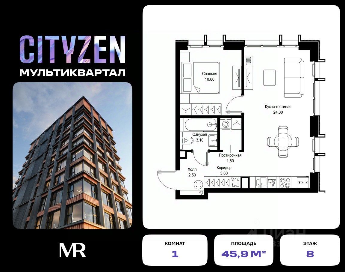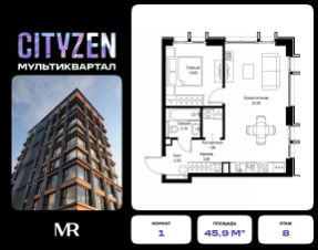 Продается 1-комнатная квартира от застройщика в жилом мультиквартале CITYZEN на 8-м этаже в корпусе #4 урбан-блока PARUS. Общая площадь лота составляет 45.90 м²