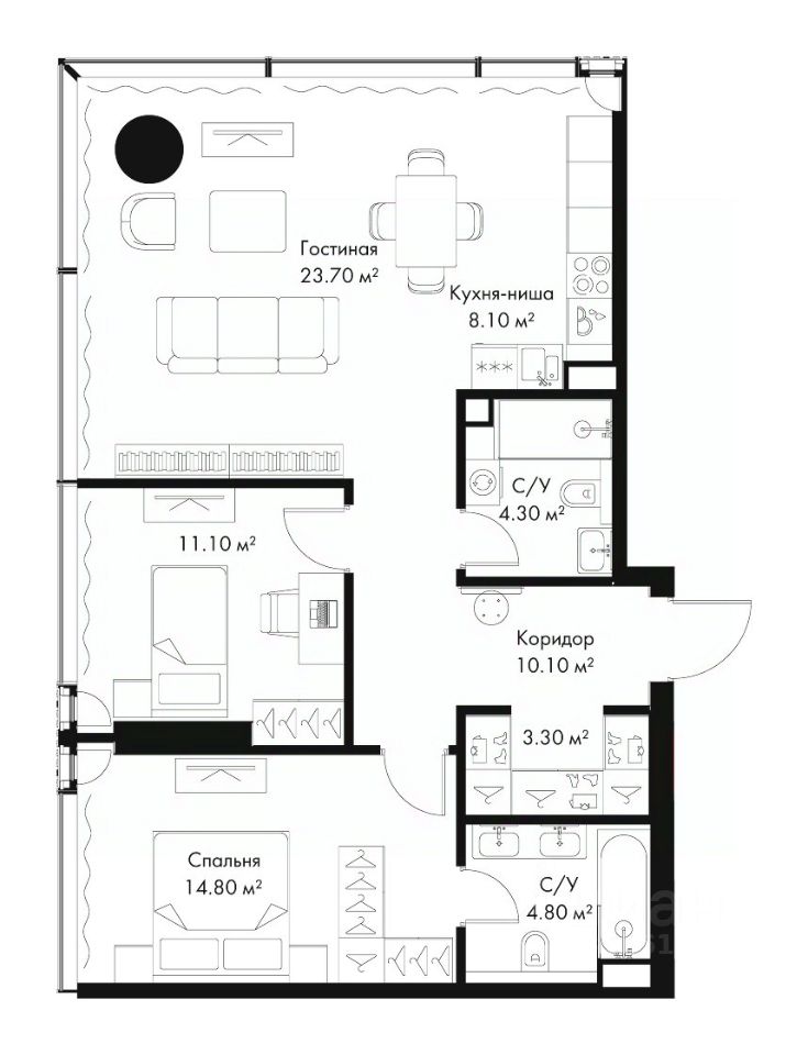 В продаже 2-комнатная квартира площадью 80.20 м² на 10-м этаже корпуса G.