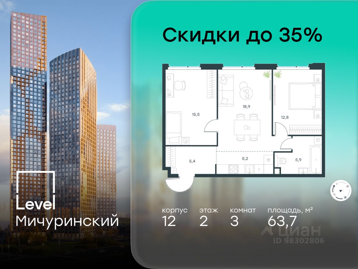 В жилом квартале, расположенном на границе с природным заказником "Долина реки Очаковки", продаётся 3-комнатная квартира площадью 63.70 кв.м без отделки. Квартира расположена на 2 этаже 11-этажного корпуса 12 в жилом комплексе бизнес-класса Level Мичуринский (компания Level Group/Левел групп).