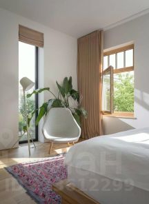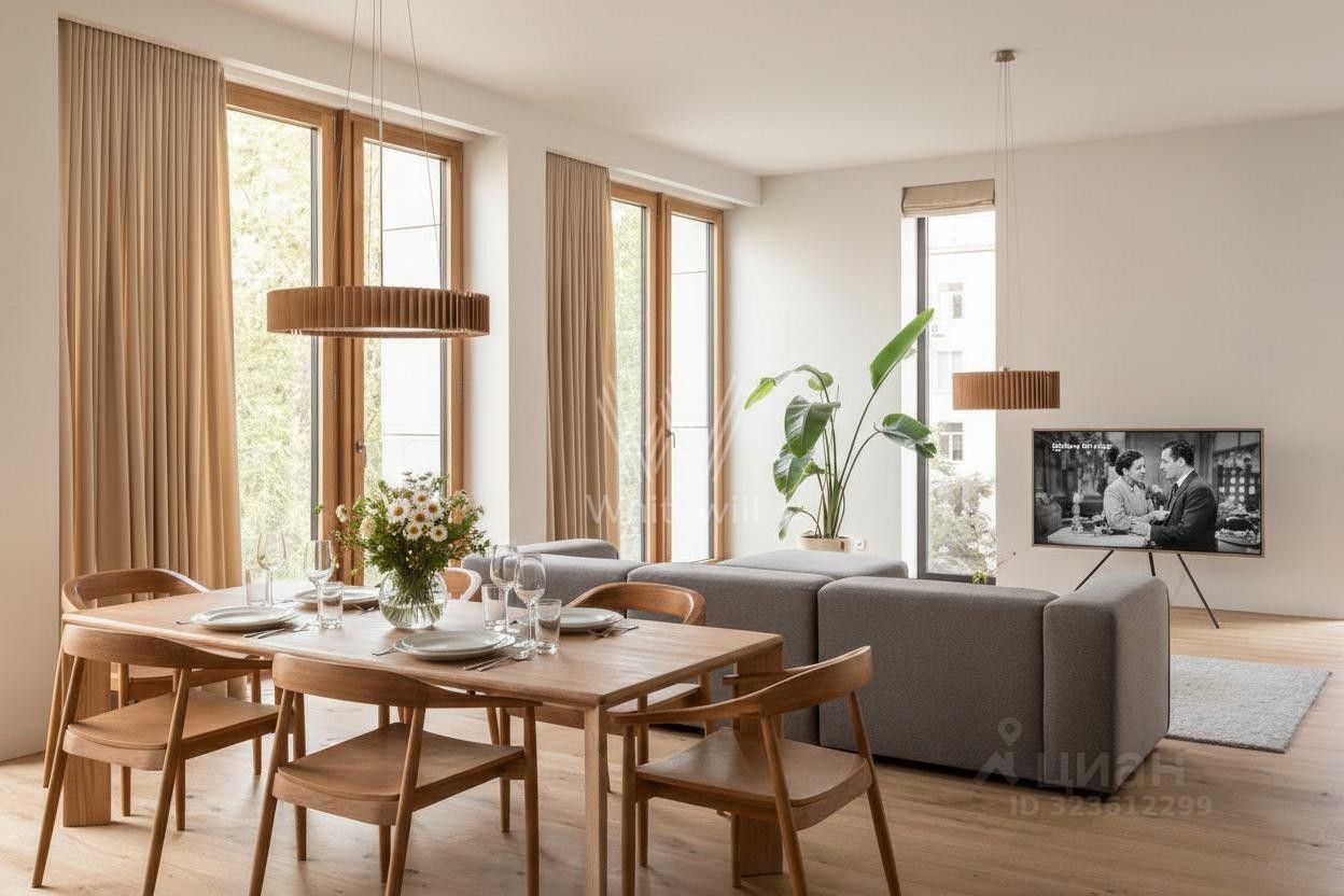 Панорамные окна с рамами из дерева ориентированы на три стороны света. Из квартиры открываются виды в Большой Тишинский переулок и в приватный двор с ветвистыми деревьями и густыми кустарниками.