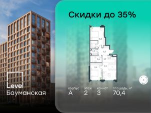 В Басманном районе (ЦАО) продается 3-комнатная квартира площадью 70.40 кв.м без отделки. Квартира расположена на 2 этаже 13-этажного корпуса " A" в жилом комплексе бизнес-класса Level Бауманская (компания Level Group).