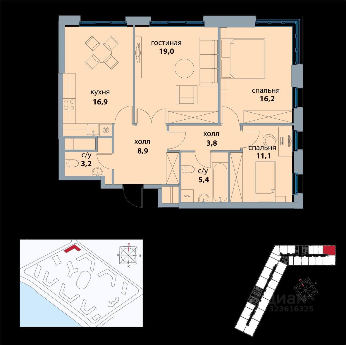 Просторная кухня-гостиная, три спальни, две ванные комнаты и функциональная прихожая с гардеробной зоной. Благодаря угловому расположению — панорамные виды и много естественного света.