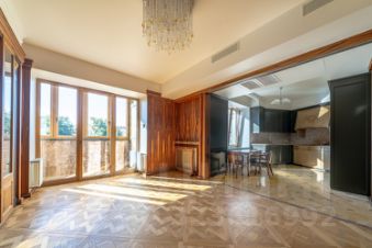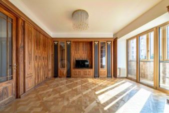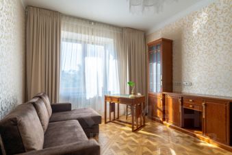 3-х комнатная квартира, общей площадью 107 кв.м. плюс лоджия, на 5-ом этаже 9-ти этажного кирпичного дома. Все окна выходят на юг. Дом расположен в центре Москвы в 3-х минутах ходьбы от метро Смоленская, в переулке Денежный за зданием МИД. Дом находится на огороженной территории со свободной парковкой внутри двора. В подъезде есть консьерж. Квартира после перепланировки и дизайнерского ремонта. Документы по перепланировке узаконены.