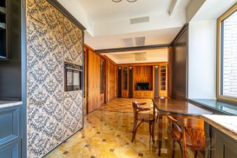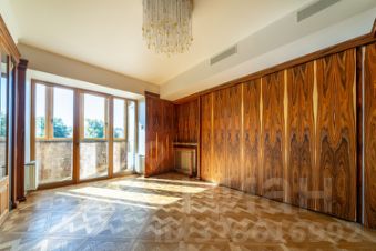 5)гостиная 17,9 кв.м. с встроенными книжными шкафами-витринами из ценных пород древесины. Стены облицованы панелями также из ценных пород древесины.