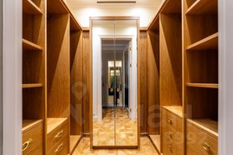 2)гардеробная 3,5 кв.м. оборудованная полками, выдвижными ящиками, открытыми шкафами и с шкафом для обуви с зеркальными дверьми. Материал - дуб;