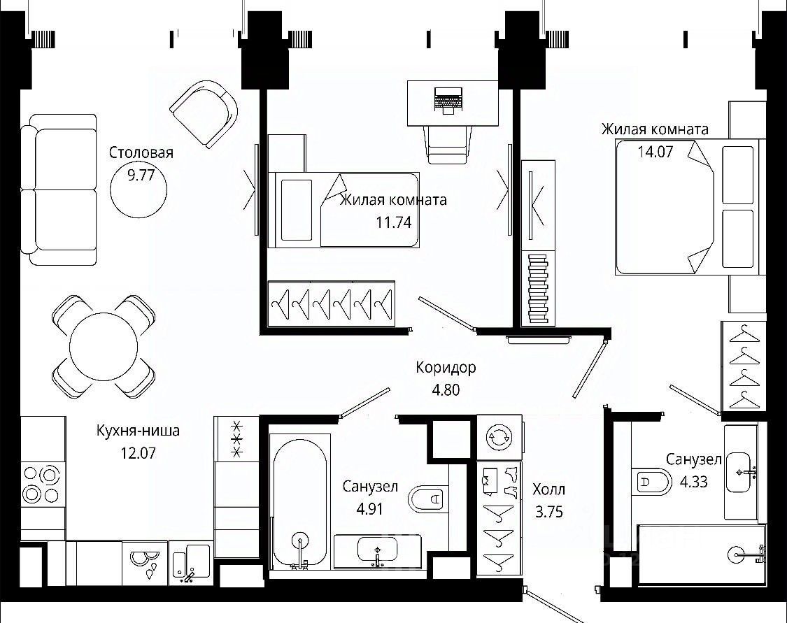 кухня-гостиная, две изолированные комнаты, два санузла, панорамные окна и высокие потолки.