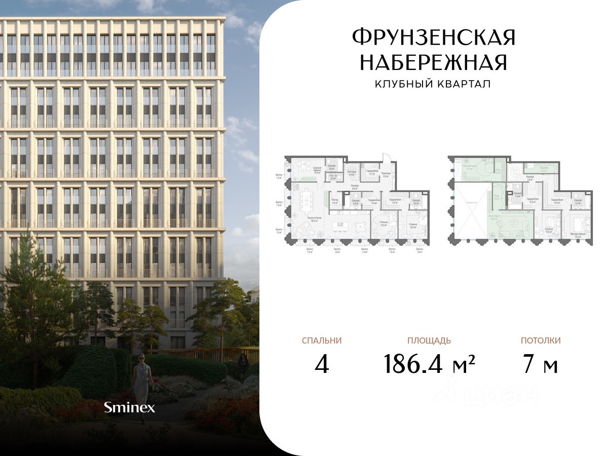 "Фрунзенская набережная" - единственный элитный клубный квартал на престижной и желанной Фрунзенской набережной, где нет и не появится новых домов такого класса. Для его жителей создан собственный просторный витражный парк площадью 3,1 гектара, где царит атмосфера загородной тишины и безмятежности. Это самый большой в элитном классе парк - он занимает 70% всей территории. Клубные дома скрыты от посторонних глаз и шума мегаполиса обильной зеленью и окружены парадной сталинской застройкой.