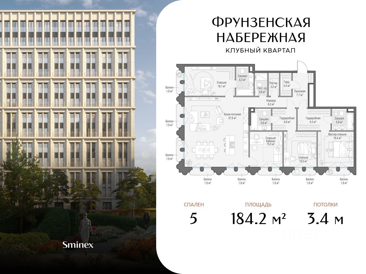 Просторная квартира с четырьмя мастер-спальнями и панорамными окнами на две стороны света. С балконов, расположенных на разных сторонах, открывают виды на цветущий сад и витражный парк с соснами. "Фрунзенская набережная" - единственный элитный клубный квартал на престижной и желанной Фрунзенской набережной, где нет и не появится новых домов такого класса. Для его жителей создан собственный просторный витражный парк площадью 3,1 гектара, где царит атмосфера загородной тишины и безмятежности. Это самый большой в элитном классе парк - он занимает 70% всей территории. Клубные дома скрыты от посторонних глаз и шума мегаполиса обильной зеленью и окружены парадной сталинской застройкой. Расположение идеально подходит для любителей прогулок и здорового образа жизни. Для жителей доступен прямой выход к Москве-реке, за которой раскинулись парк Горького, Нескучный сад и Воробьёвы горы - всего 219 гектаров природных парков. На набережной маршруты для бега, пеших и велопрогулок. Спортивный комплекс "Лужники" расположен в 2 километрах. В уникальном клубном квартале создана беспрецедентно масштабная среда для жизни, деловых и личных знакомств, воспитания и игр детей среди равных по статусу соседей в культовом месте и окружении. На его территории сформирована впечатляющая по масштабам и насыщенности инфраструктура только для жителей общей площадью 2700 кв. м. Для максимального комфорта территория своего парка разделена на зоны активного и спокойного отдыха. На свежем воздухе для маленьких жителей разных возрастов оборудована самая большая в элитном классе детская игровая площадка (600 кв. м) по стандарту Kids Lab. Для активного отдыха создана уникальная среди элитных домов многофункциональная площадка (368 кв. м) для футбола, бадминтона, баскетбола, волейбола и других командных видов спорта, также предусмотрена зона для воркаута площадью более 100 кв. м. Для спокойного досуга на природе в своём парке созданы пейзажный пруд с витражным навесом и террасой, тихие зоны у воды, оазисы комфорта - зелёные комнаты с мягкой мебелью и шезлонгами. Парк располагает к прогулкам, в нём много маршрутов вокруг арт-объектов, есть пряный сад с ароматными травами. Здесь можно устроить семейный пикник, почитать книгу в тени деревьев и забыть о том, что живёте в центре города, подарив себе полноценный отдых на природе. В клубном квартале только для жителей создан беспрецедентно большой в элит-классе инфраструктурный центр - Clubhouse. Он расположен в отдельном здании и формирует атмосферу закрытого камерного клуба для своих, где каждый найдёт себе занятие по душе. В Clubhouse комплексная и разнообразная инфраструктура, которая создана по фирменным стандартам Sminex и объединяет лучшие возможности для общения и отдыха, воспитания и развития детей, поддержания здоровья и занятий спортом. Для встреч, отдыха и общения жителей в Clubhouse создана клубная гостиная площадью более 170 кв. м с террасой на свежем воздухе по стандарту Friends Lab. Элегантный дизайн лаундж-зоны располаг