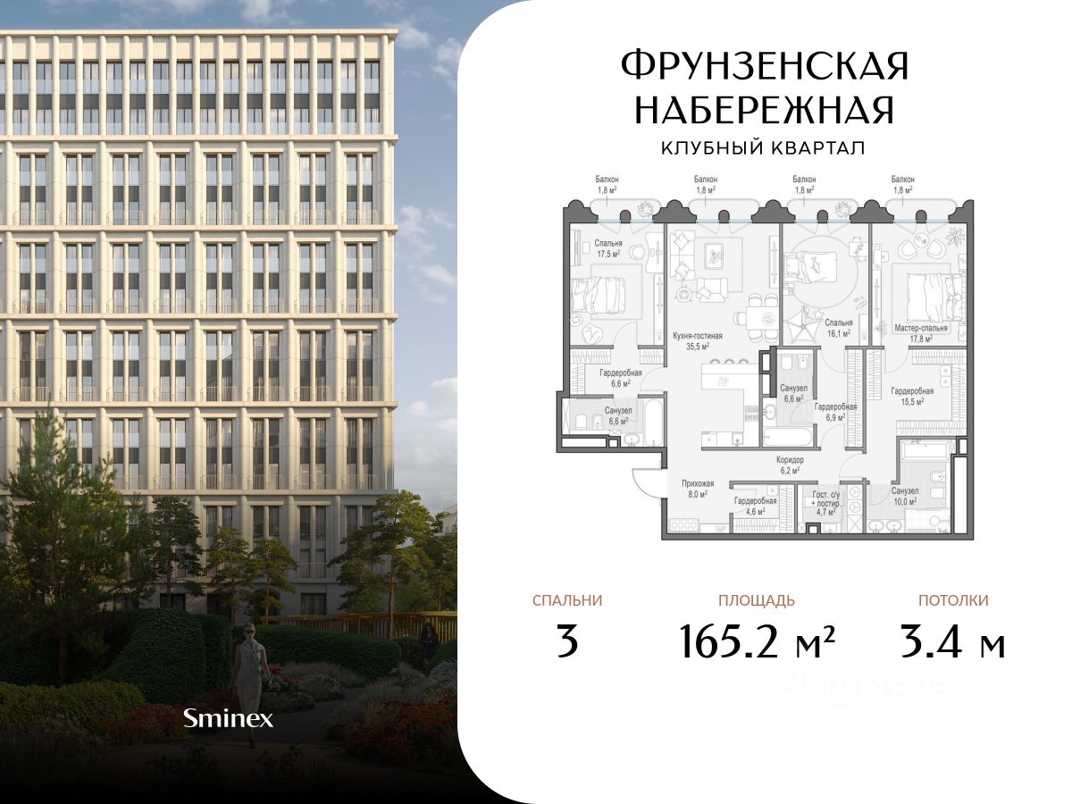"Фрунзенская набережная" - единственный элитный клубный квартал на престижной и желанной Фрунзенской набережной, где нет и не появится новых домов такого класса. Для его жителей создан собственный просторный витражный парк площадью 3,1 гектара, где царит атмосфера загородной тишины и безмятежности. Это самый большой в элитном классе парк - он занимает 70% всей территории. Клубные дома скрыты от посторонних глаз и шума мегаполиса обильной зеленью и окружены парадной сталинской застройкой.
