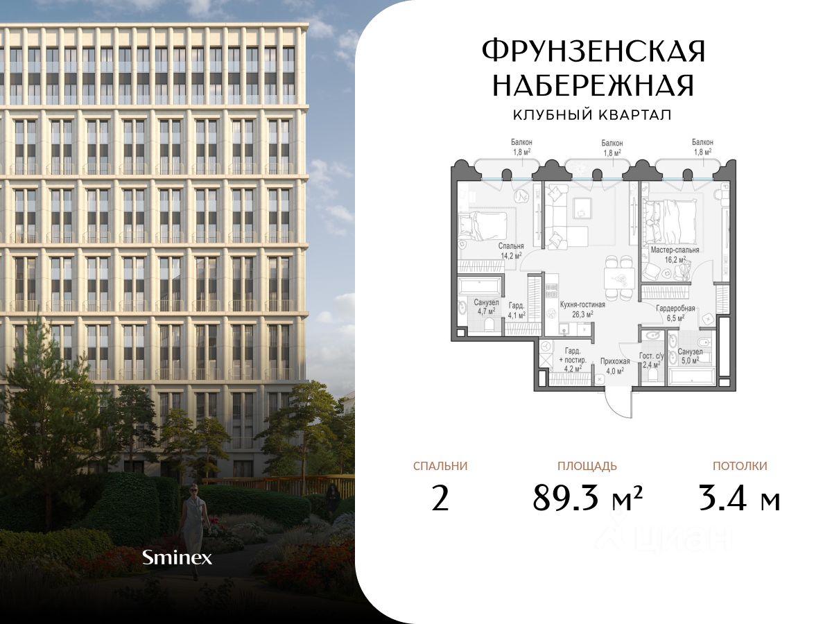 Квартира идеальной планировки с двумя мастер-спальнями. Здесь всё продумано до сантиметра, и в каждом жилом помещении есть уютный балкон. "Фрунзенская набережная" - единственный элитный клубный квартал на престижной и желанной Фрунзенской набережной, где нет и не появится новых домов такого класса. Для его жителей создан собственный просторный витражный парк площадью 3,1 гектара, где царит атмосфера загородной тишины и безмятежности. Это самый большой в элитном классе парк - он занимает 70% всей территории. Клубные дома скрыты от посторонних глаз и шума мегаполиса обильной зеленью и окружены парадной сталинской застройкой. Расположение идеально подходит для любителей прогулок и здорового образа жизни. Для жителей доступен прямой выход к Москве-реке, за которой раскинулись парк Горького, Нескучный сад и Воробьёвы горы - всего 219 гектаров природных парков. На набережной маршруты для бега, пеших и велопрогулок. Спортивный комплекс "Лужники" расположен в 2 километрах. В уникальном клубном квартале создана беспрецедентно масштабная среда для жизни, деловых и личных знакомств, воспитания и игр детей среди равных по статусу соседей в культовом месте и окружении. На его территории сформирована впечатляющая по масштабам и насыщенности инфраструктура только для жителей общей площадью 2700 кв. м. Для максимального комфорта территория своего парка разделена на зоны активного и спокойного отдыха. На свежем воздухе для маленьких жителей разных возрастов оборудована самая большая в элитном классе детская игровая площадка (600 кв. м) по стандарту Kids Lab. Для активного отдыха создана уникальная среди элитных домов многофункциональная площадка (368 кв. м) для футбола, бадминтона, баскетбола, волейбола и других командных видов спорта, также предусмотрена зона для воркаута площадью более 100 кв. м. Для спокойного досуга на природе в своём парке созданы пейзажный пруд с витражным навесом и террасой, тихие зоны у воды, оазисы комфорта - зелёные комнаты с мягкой мебелью и шезлонгами. Парк располагает к прогулкам, в нём много маршрутов вокруг арт-объектов, есть пряный сад с ароматными травами. Здесь можно устроить семейный пикник, почитать книгу в тени деревьев и забыть о том, что живёте в центре города, подарив себе полноценный отдых на природе. В клубном квартале только для жителей создан беспрецедентно большой в элит-классе инфраструктурный центр - Clubhouse. Он расположен в отдельном здании и формирует атмосферу закрытого камерного клуба для своих, где каждый найдёт себе занятие по душе. В Clubhouse комплексная и разнообразная инфраструктура, которая создана по фирменным стандартам Sminex и объединяет лучшие возможности для общения и отдыха, воспитания и развития детей, поддержания здоровья и занятий спортом. Для встреч, отдыха и общения жителей в Clubhouse создана клубная гостиная площадью более 170 кв. м с террасой на свежем воздухе по стандарту Friends Lab. Элегантный дизайн лаундж-зоны располагает как к общению, так и к уединённому отдыху. Здесь комфо
