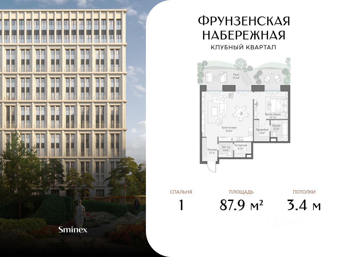 "Фрунзенская набережная" - единственный элитный клубный квартал на престижной и желанной Фрунзенской набережной, где нет и не появится новых домов такого класса. Для его жителей создан собственный просторный витражный парк площадью 3,1 гектара, где царит атмосфера загородной тишины и безмятежности. Это самый большой в элитном классе парк - он занимает 70% всей территории. Клубные дома скрыты от посторонних глаз и шума мегаполиса обильной зеленью и окружены парадной сталинской застройкой.