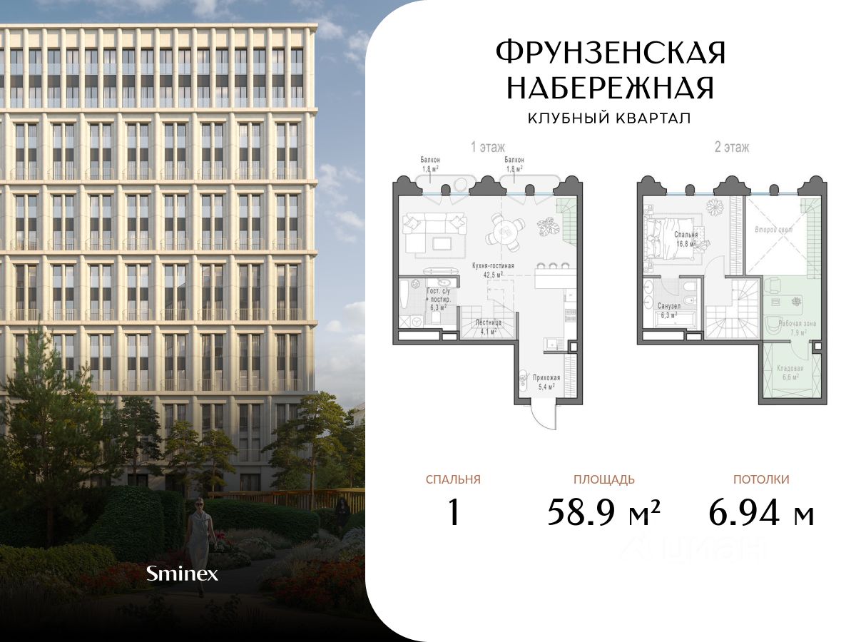 Просторная двухэтажная квартира с одной спальней. Площадь первого этажа 58,9 метра. Продуманное планировочное решение позволит комфортно отделить приватную зону от общественной.