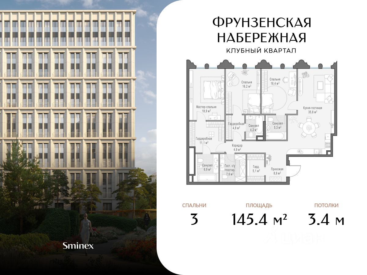 "Фрунзенская набережная" - единственный элитный клубный квартал на престижной и желанной Фрунзенской набережной, где нет и не появится новых домов такого класса. Для его жителей создан собственный просторный витражный парк площадью 3,1 гектара, где царит атмосфера загородной тишины и безмятежности. Это самый большой в элитном классе парк - он занимает 70% всей территории. Клубные дома скрыты от посторонних глаз и шума мегаполиса обильной зеленью и окружены парадной сталинской застройкой.