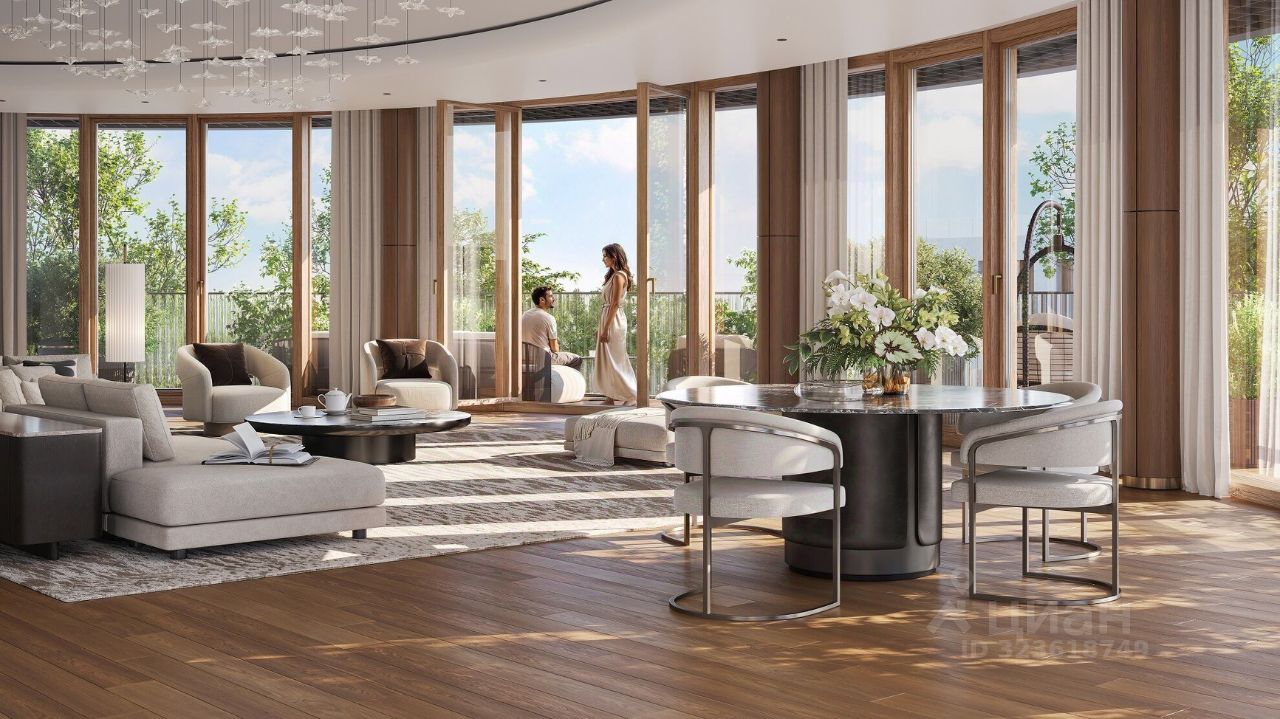 Просторная квартира, занимающая половину площади пятого этажа современного дома С1. Четыре спальни и роскошная полукруглая гостиная, из окон которой открываются великолепные закатные виды.