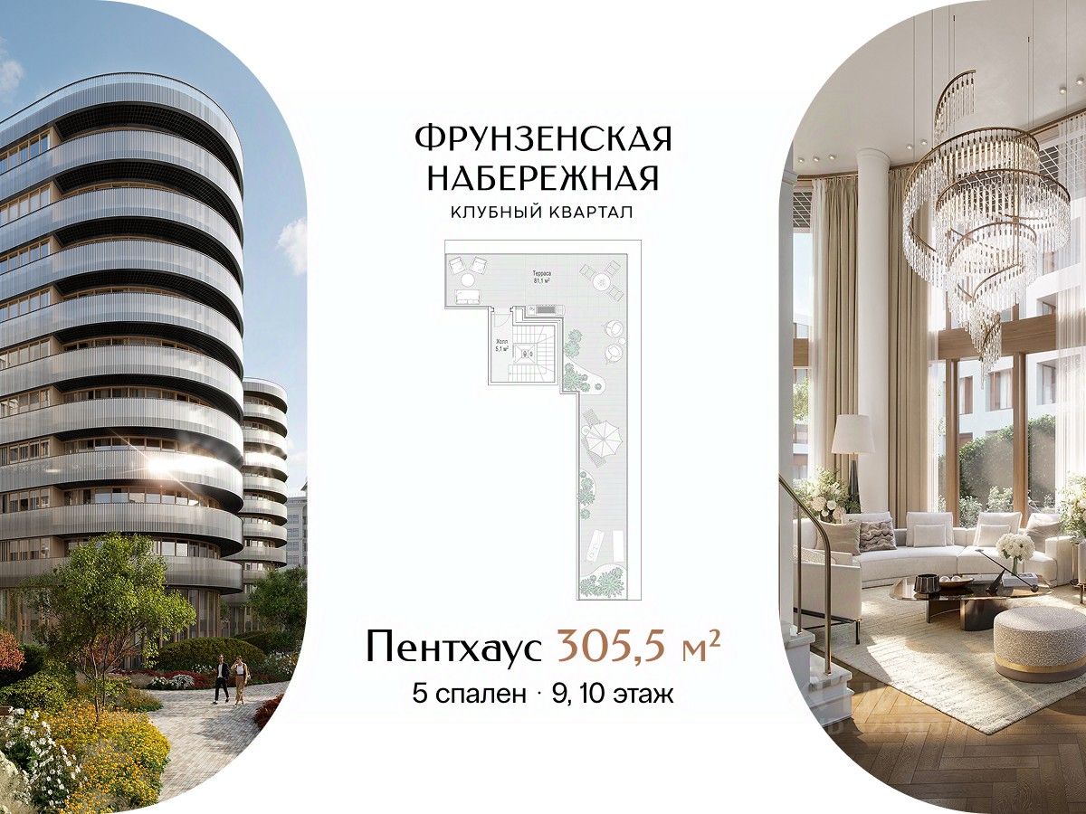 Просторный двухэтажный пентхаус с собственной террасой на крыше. В пентхаусе: • Пять спален, две из которых с ванными комнатами с панорамными окнами • Кухня-гостиная с камином и балконом • Собственная терраса • Потолки 3,67 м Фрунзенская набережная - один из самых желанных районов Москвы, на уровне Остоженки и Патриарших. Поблизости нет и не появится проектов элитного класса: набережная равномерно застроена и клубный квартал завершает формирование этой локации. Масштабная премиальная инфраструктура доступна только резидентам.В большом Clubhouse и на территории парка есть всё для насыщенной жизни вне квартиры: двухэтажный фитнес, многофункциональная спортивная площадка, клубная гостиная и самое большое в элитном классе детское игровое пространство. Клубный квартал "Фрунзенская набережная" - место для приватной и комфортной жизни в окружении людей со схожими ценностями. Здесь тихо, будто за городом: сталинская застройка и высокие сосны укрывают жителей от шума и посторонних глаз. Fine Development - это комплексный, вовлечённый и ответственный подход Sminex. Результат этого - совершенные дома и сервисы: восхищающие, удобные и красивые, с высочайшим уровнем заботы на всех этапах жизни с нами.