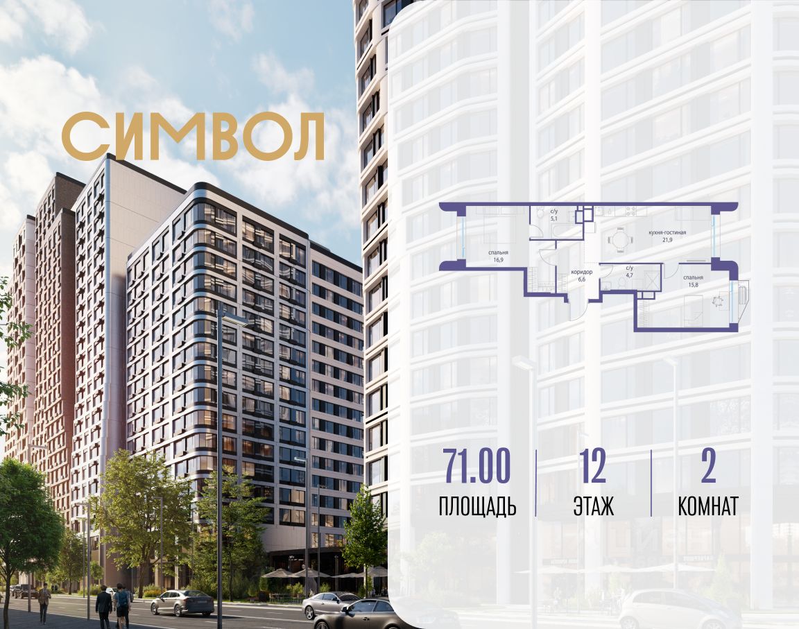 Продается 2-комнатная квартира от застройщика: общая площадь 71.00 м², жилая 32.70 м², кухня 21.90 м², 12-й этаж, жилой квартал "Гордость", корпус 36 (секция 1). Срок сдачи: 2 квартал 2029 года.