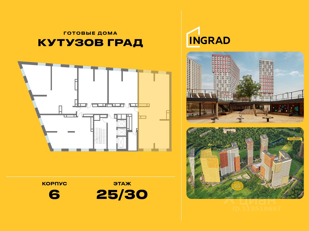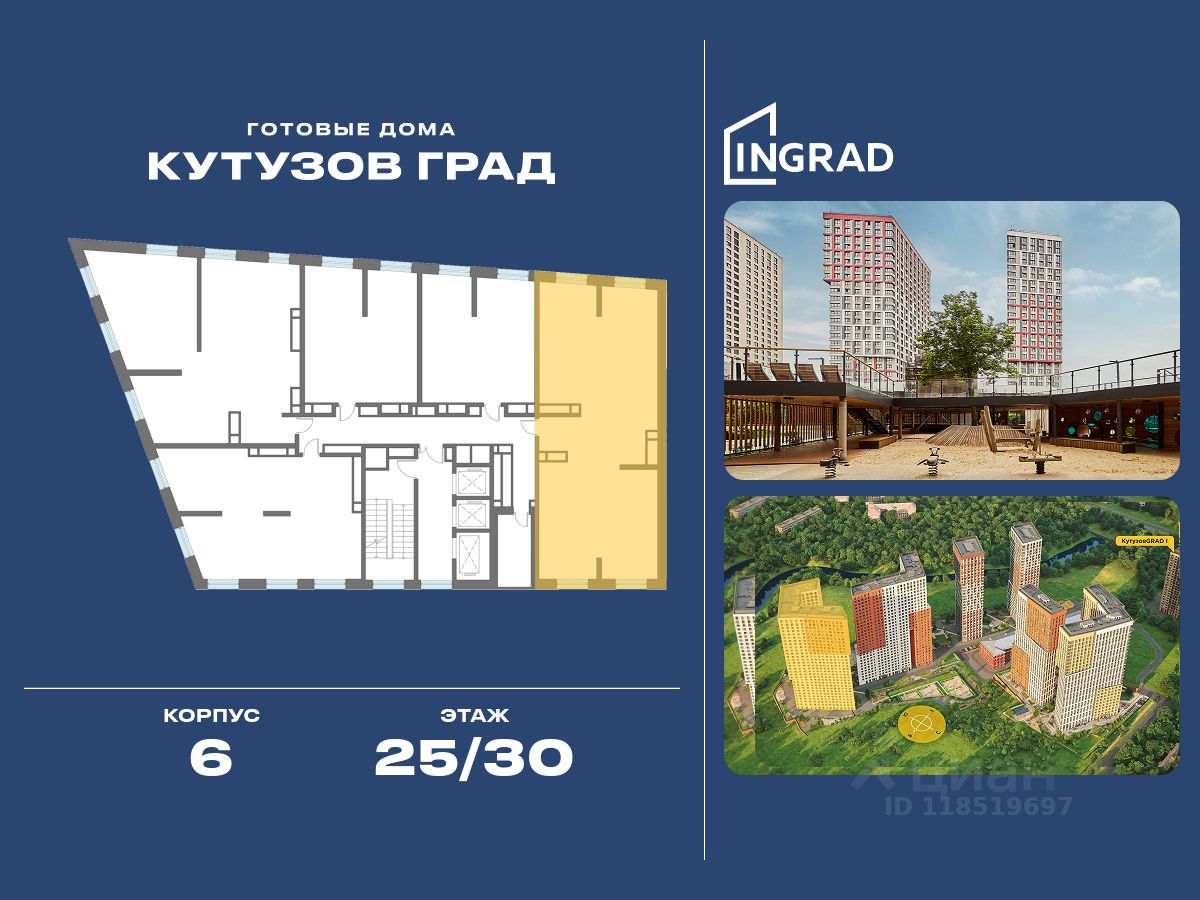 К покупке предлагается 3-спальная квартира площадью 103.30 кв.м, расположенная на 25 этаже 30-этажного корпуса 6, в жилом квартале бизнес-класса "Кутузов Град".