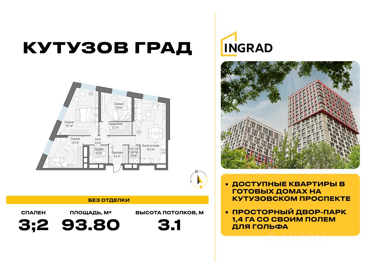 К покупке предлагается 4-спальная квартира площадью 93.80 кв.м, расположенная на 28 этаже 30-этажного корпуса 6, в жилом квартале бизнес-класса "Кутузов Град".