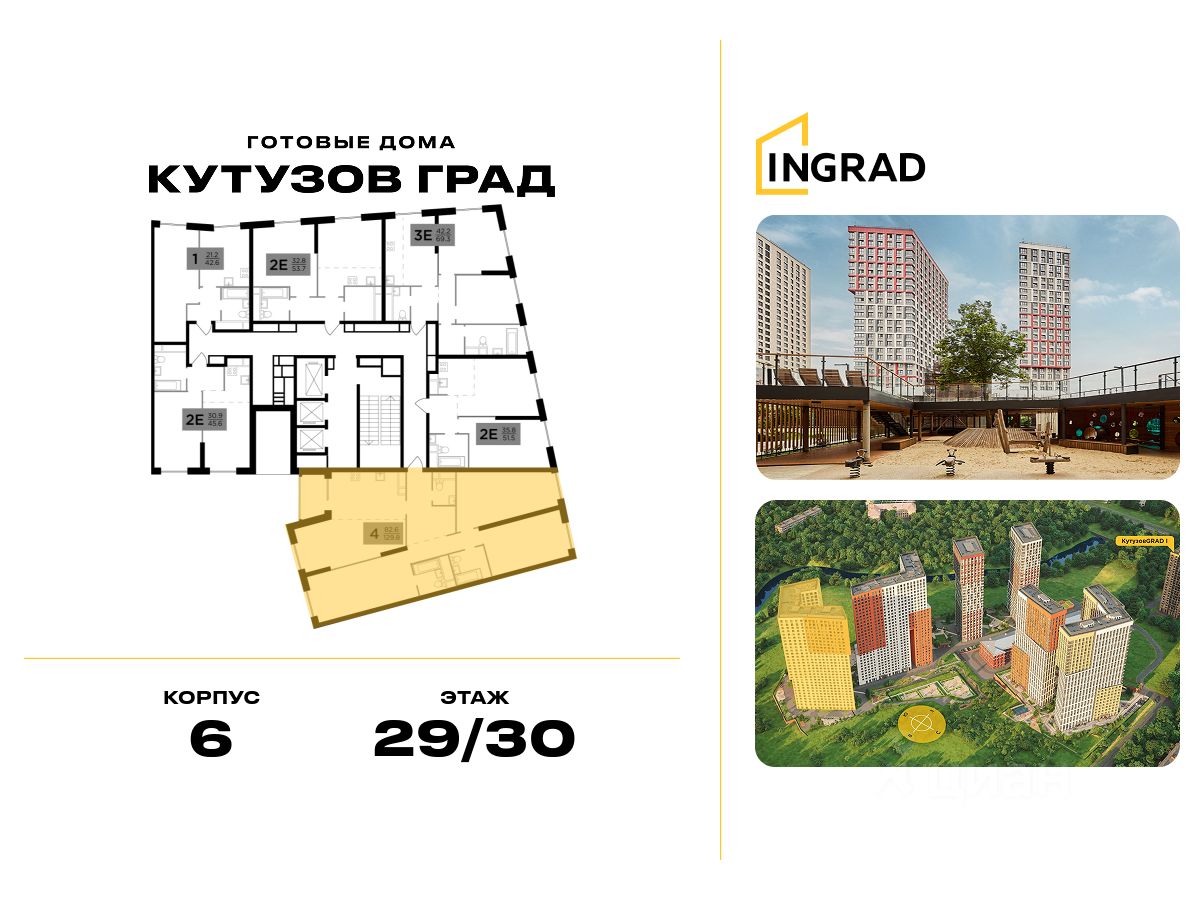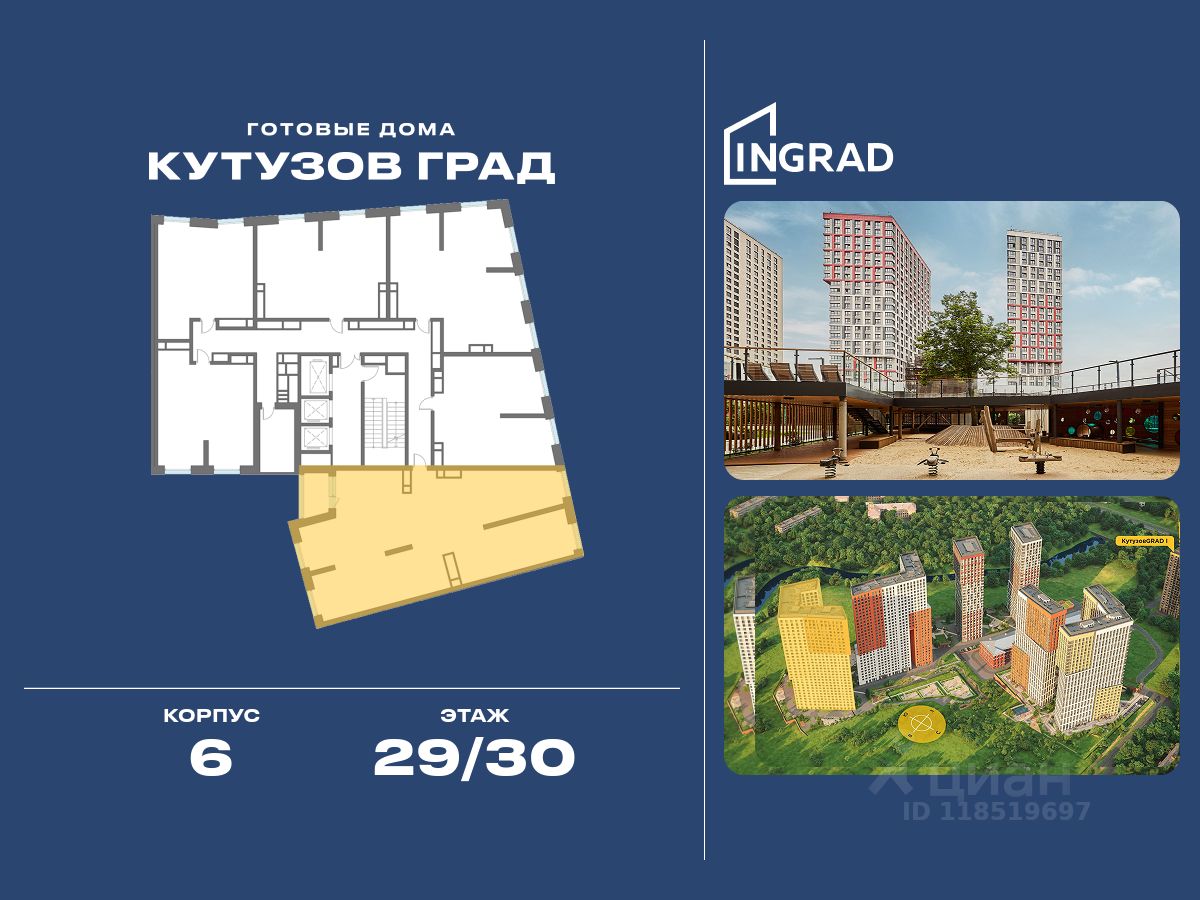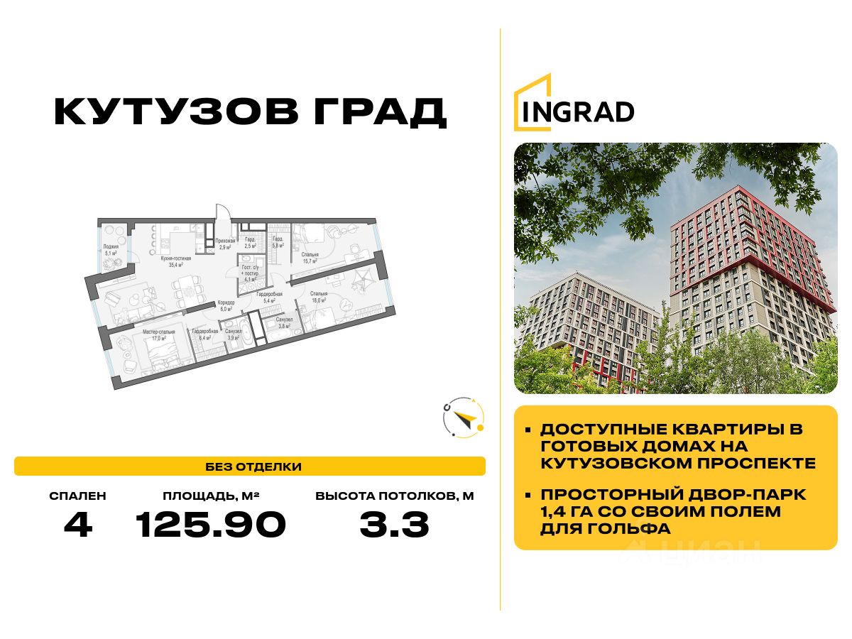 К покупке предлагается 4-спальная квартира площадью 125.90 кв.м, расположенная на 29 этаже 30-этажного корпуса 6, в жилом квартале бизнес-класса "Кутузов Град".