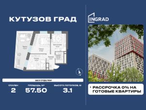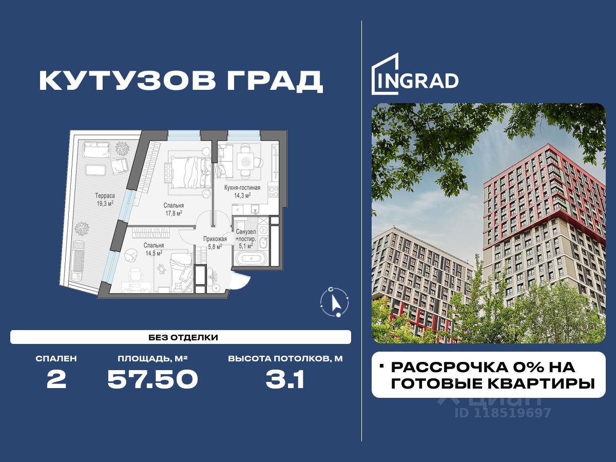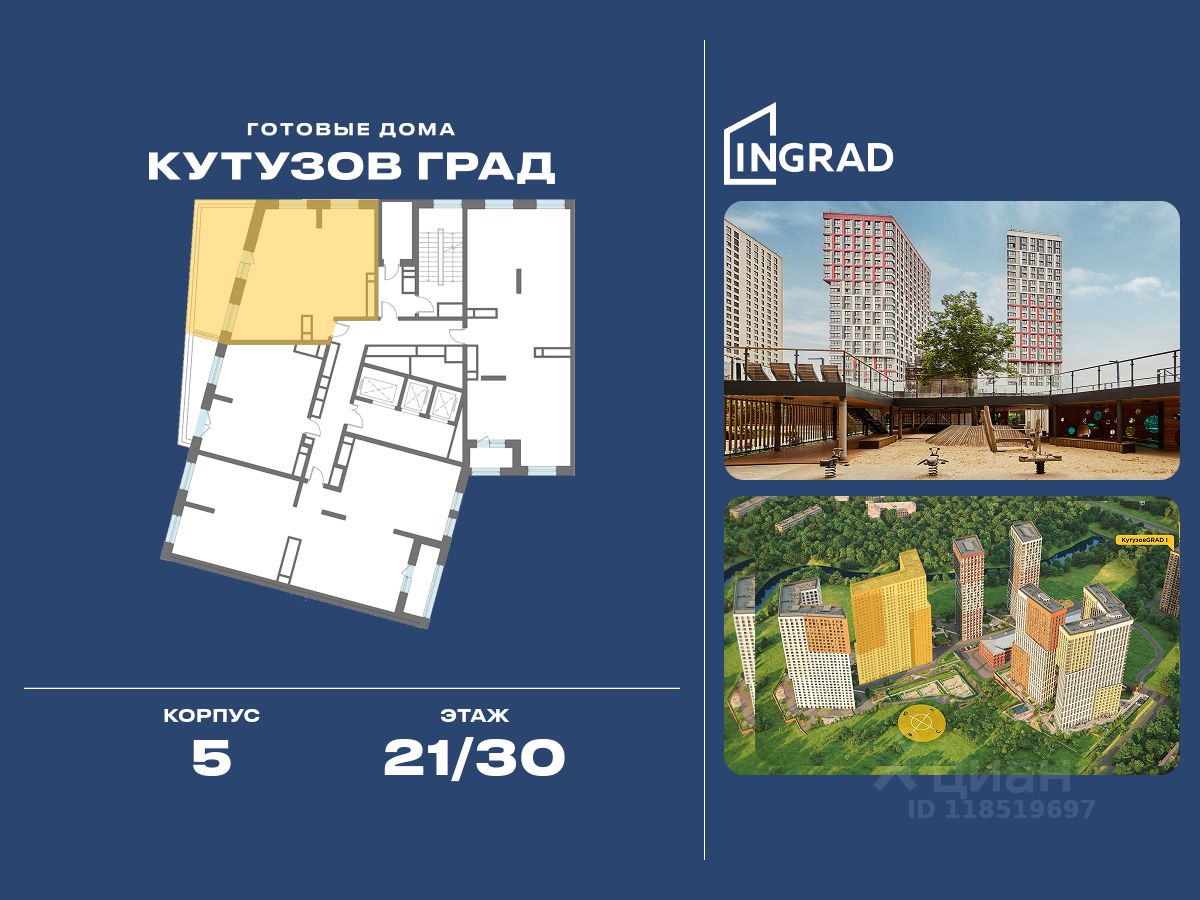 К покупке предлагается 2-спальная квартира площадью 57.50 кв.м, расположенная на 21 этаже 30-этажного корпуса 5, в жилом квартале бизнес-класса "Кутузов Град".