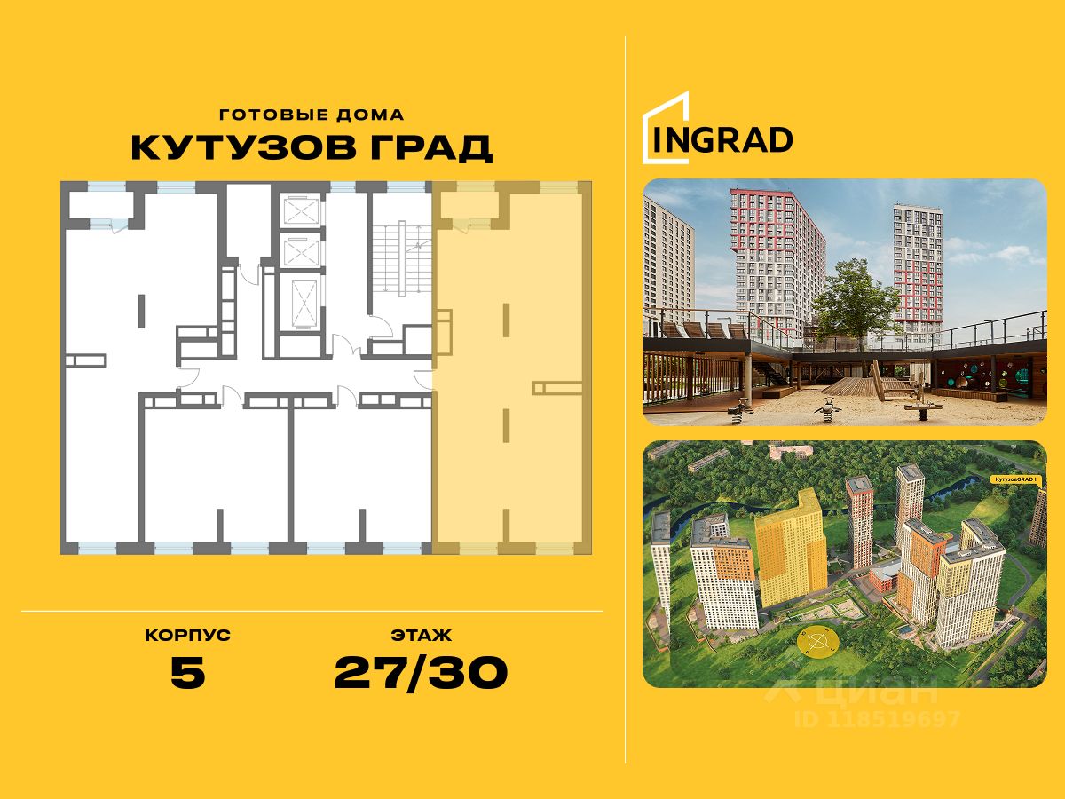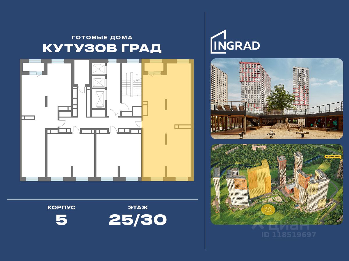 К покупке предлагается 3-спальная квартира площадью 95.90 кв.м, расположенная на 27 этаже 30-этажного корпуса 5, в жилом квартале бизнес-класса "Кутузов Град".