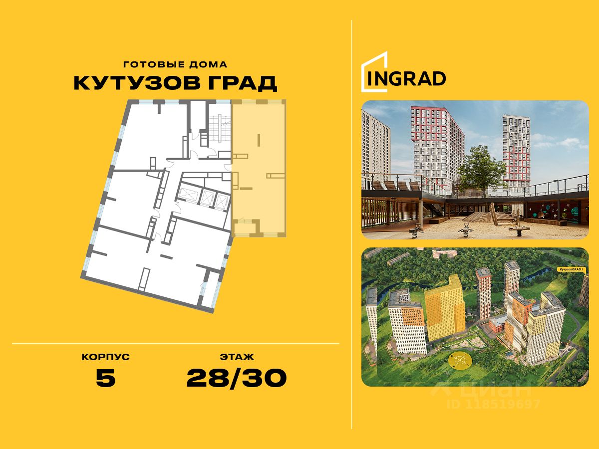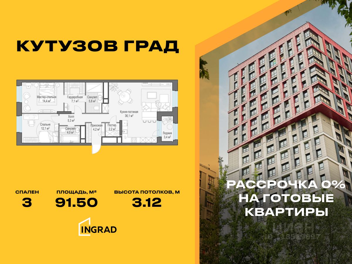 К покупке предлагается 3-спальная квартира площадью 91.50 кв.м, расположенная на 28 этаже 30-этажного корпуса 5, в жилом квартале бизнес-класса "Кутузов Град".