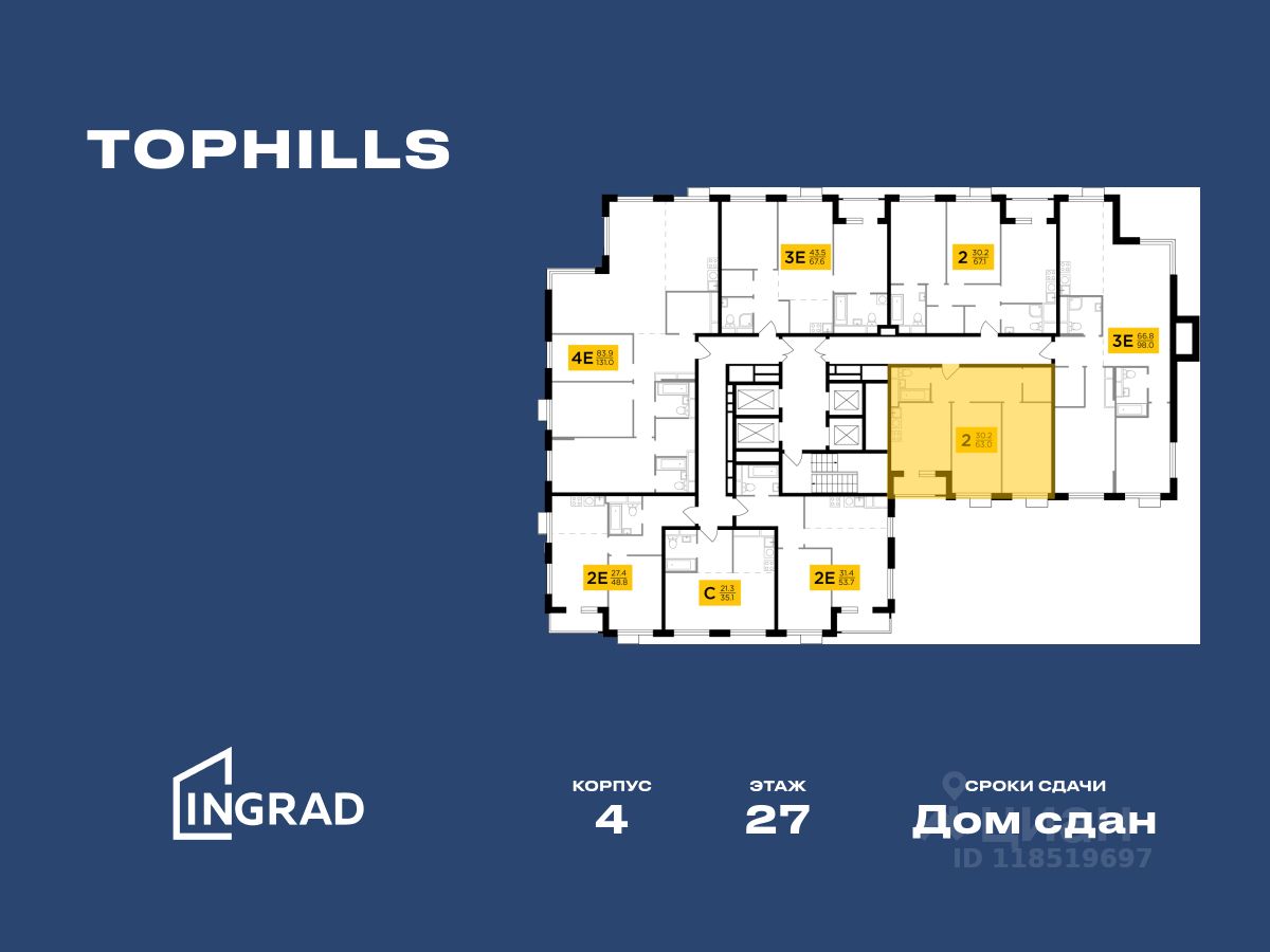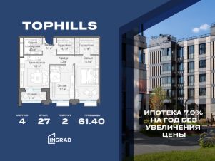 Прямая продажа от застройщика. В жилом квартале, расположенном в Нагорном районе Москвы, продаётся 2-спальная квартира площадью 61.40 кв.м без отделки. Квартира расположена на 27 этаже 27-этажного дома, корпус 4, в жилом квартале бизнес-класса TopHILLS (застройщик ГК Инград).