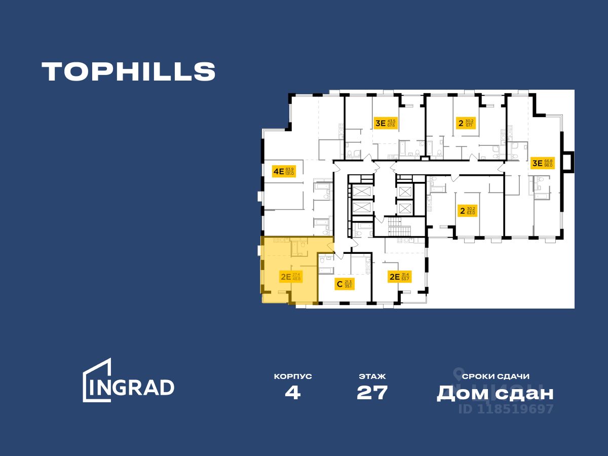 Прямая продажа от застройщика. В жилом квартале, расположенном в Нагорном районе Москвы, продаётся 2-спальная квартира площадью 47.20 кв.м без отделки. Квартира расположена на 27 этаже 27-этажного дома, корпус 4, в жилом квартале бизнес-класса TopHILLS (застройщик ГК Инград).