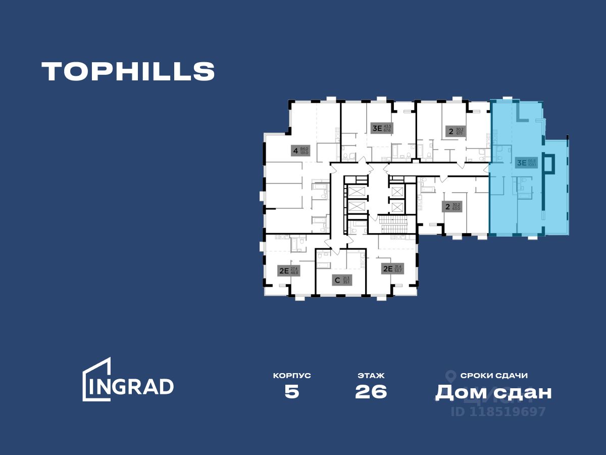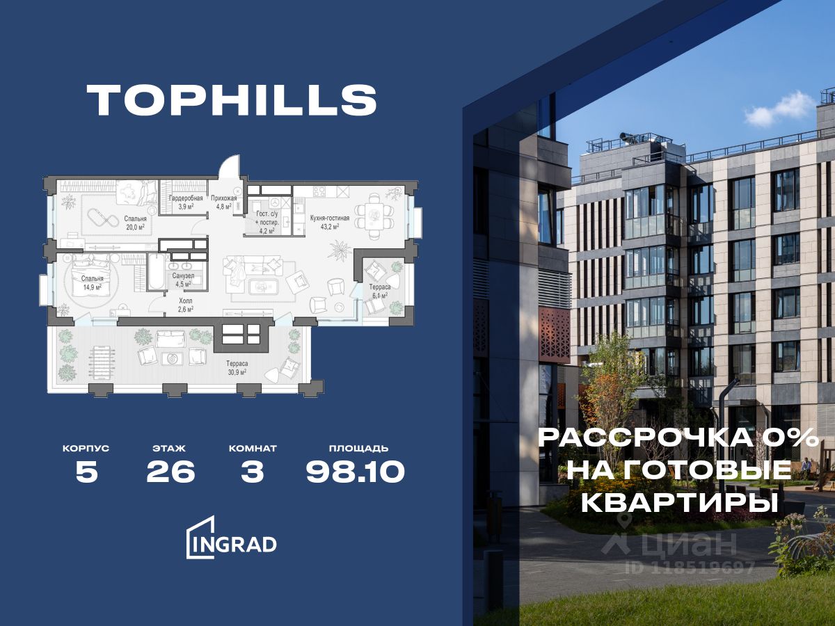 Прямая продажа от застройщика. В жилом квартале, расположенном в Нагорном районе Москвы, продаётся 3-спальная квартира площадью 98.10 кв.м без отделки. Квартира расположена на 26 этаже 27-этажного дома, корпус 5, в жилом квартале бизнес-класса TopHILLS (застройщик ГК Инград).