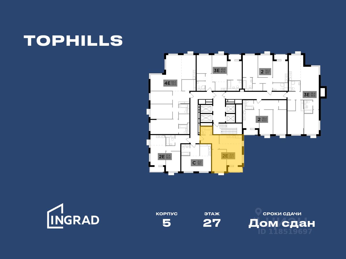 Прямая продажа от застройщика. В жилом квартале, расположенном в Нагорном районе Москвы, продаётся 2-спальная квартира площадью 52.10 кв.м без отделки. Квартира расположена на 27 этаже 27-этажного дома, корпус 5, в жилом квартале бизнес-класса TopHILLS (застройщик ГК Инград).