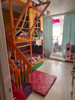 В детской комнате установлен подиум, с выдвижными ящиками по всей ширине комнаты.