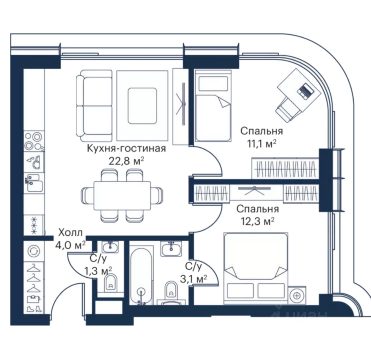 большая кухня-гостиная 23,2 м2 , две спальни 12,6 и 11,6 м 2, два сан.узла, высокий 28 этаж с прекрасным видом на Москву,