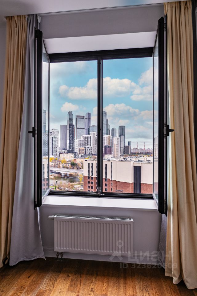 Кухня-гостиная и одна комната (кабинет) выходят окнами во внутренний двор (закатная сторона), а спальня и еще одна комната (детская) располагаются на рассветной стороне! Из окон открывается шикарный вид на Москва-сити, Москва-реку, МГУ, видна Поклонная гора и салюты по праздникам. Из спальни выходит большой, просторный панорамный балкон с теплыми полами.