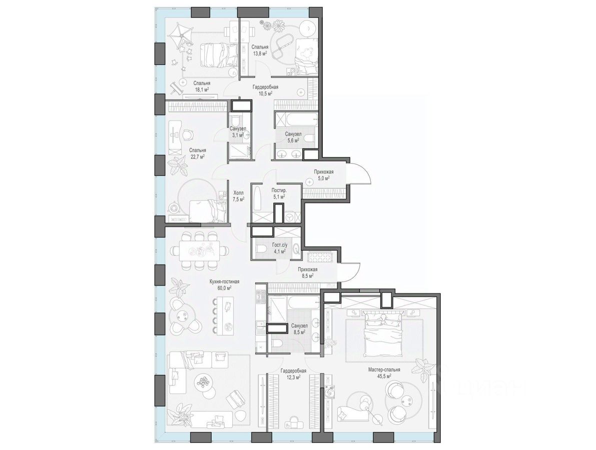 Комфортная и продуманная до мелочей 4-спальная квартира площадью 228.20 кв. м на 13 этаже в клубном доме 16. Увеличенная площадь окон и высота потолков 3.23 м дарят впечатляющие виды на парки, зеленые зоны и природные заказники.