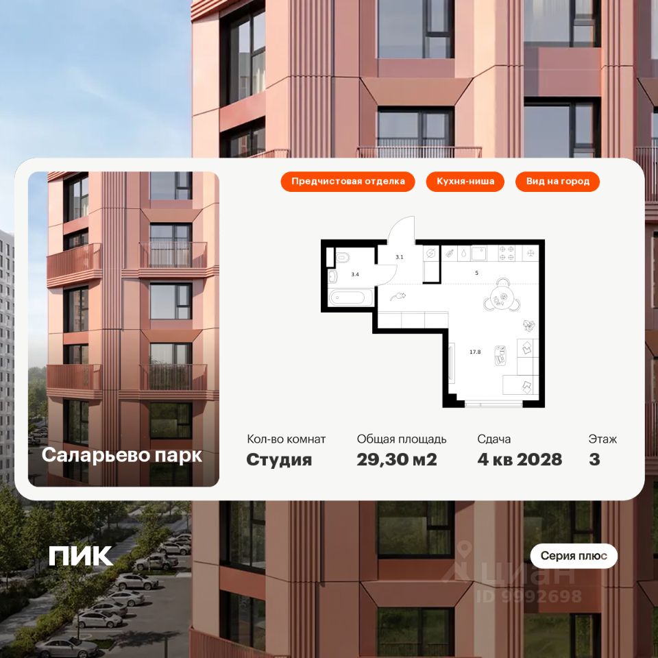 Продаётся квартира-студия площадью 29,3 кв.м на 3 этаже 24 этажного дома (Корпус 82.4, Секция 4) проекта ПИК Саларьево парк. Светлый просторный подъезд на уровне земли, функциональная планировка, большие окна, предчистовая отделка.