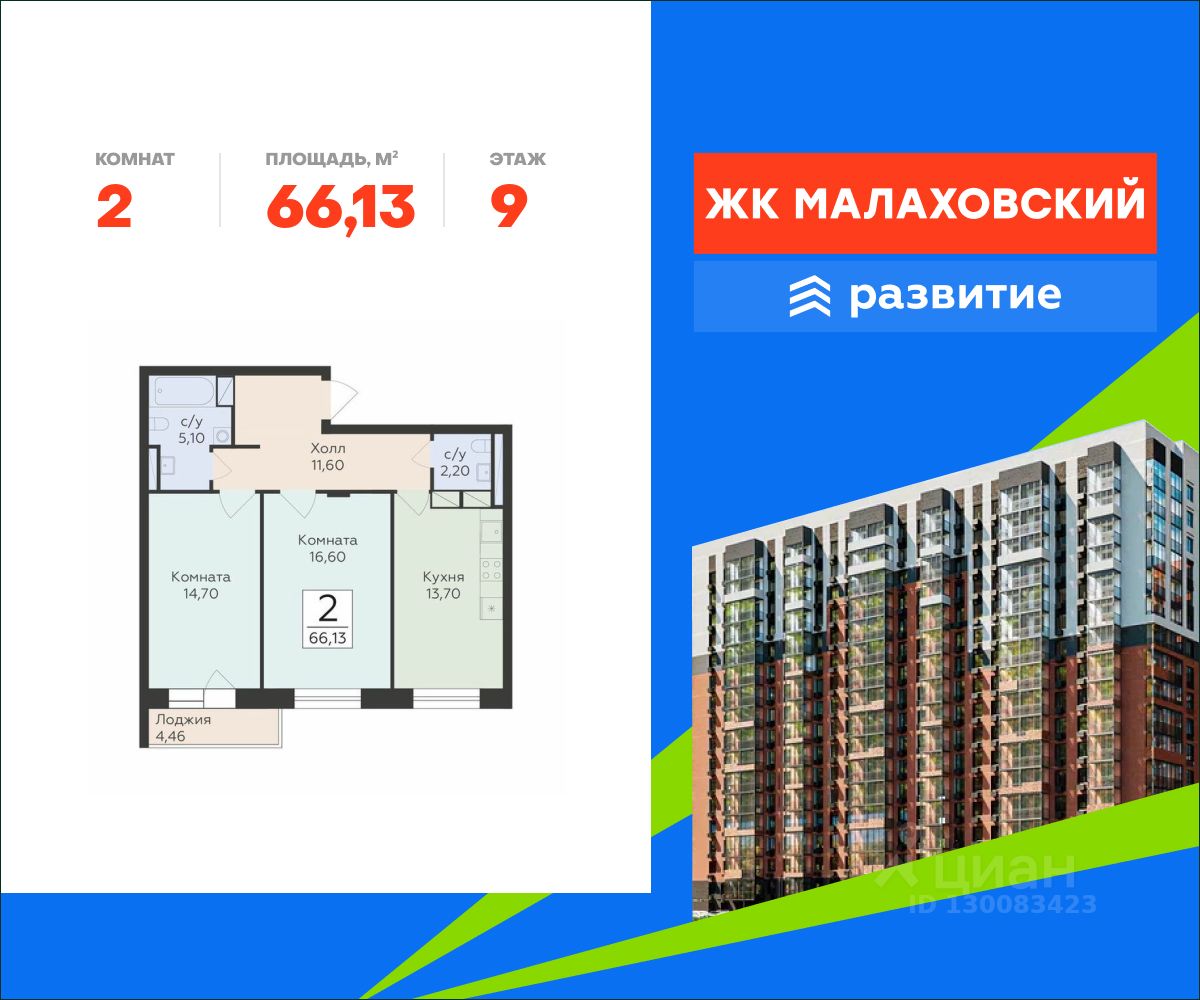Продается 2-комнатная квартира площадью 66.13 . Квартира расположена на 9 этаже 17 этажного дома, в 201 корпусе.