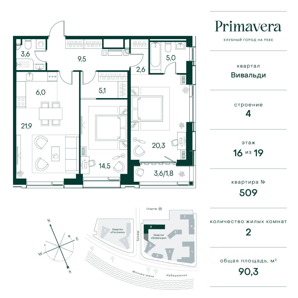Клубный город на реке Primavera — это современный жилой комплекс премиум-класса, расположенный на первой береговой линии Москвы-реки в экологически чистом районе Покровское-Стрешнево. Под панорамными окнами квартир находится собственный экопарк с продуманной сетью прогулочных дорожек и современными детскими и спортивными площадками. За парком расположена набережная с собственным пляжем и зонами для отдыха. Клубный город на реке Primavera предлагает широкий выбор планировок для различных жизненных сценариев: от просторных однокомнатных квартир до пентхаусов и жилых помещений с террасами и патио. Выберите из 120 вариантов эргономичных планировок стандартного и евроформата. Из каждой квартиры открываются красивые виды на реку с углом обзора в 270 градусов. Дизайнерские лобби предлагают панорамный обзор на благоустроенный двор. Высокие потолки в 6 метров и качественная отделка создают атмосферу, схожую с пятизвездочными отелями. В Primavera есть всё необходимое для комфортной жизни в мегаполисе: • Образование для детей в шаговой доступности: 4 школы, 8 детских садов и развивающие центры с кружками и секциями. • Удобства на расстоянии приятной прогулки: супермаркеты, кафе, рестораны с верандами, салоны красоты, аптеки и многофункциональный центр для шоппинга и развлечений. • Умный дом: автоматизированное бесконтактное управление основными системами доступа и безопасности через мобильное приложение. Клубный город на реке Primavera выгодно сочетает комфорт городской жизни с близостью к природе. Живите в месте, где все создано для вашего удобства!