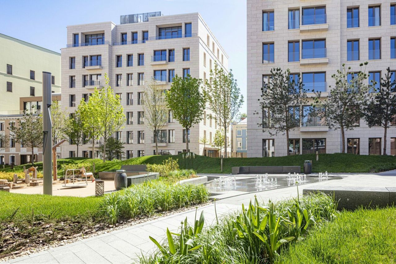 В комплексе потрясающей красоты внутренний двор-сад площадью 0.8 Га от известного британского бюро Gillespies. В саду высажены сосны, липы, ели, берёзы, различные виды кустарников, цветов и трав, обустроены зеленые аллеи, лаунж-зоны, фонтан, ручей и детская площадка от немецкой компании Richter Spielgeraete.