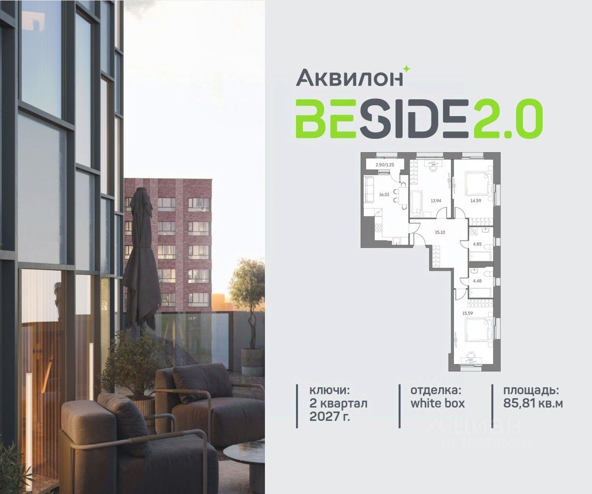 Продается просторная 3-комнатная квартира на 6 этаже современного жилого комплекса Beside 2.0. Вид из окон: во двор и на улицу. Срок сдачи: 2 кв. 2027 г.