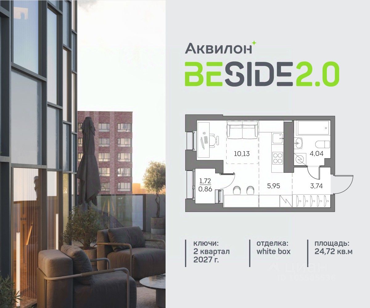 Продается просторная студия на 18 этаже современного жилого комплекса Beside 2.0. Вид из окон: на улицу. Срок сдачи: 2 кв. 2027 г.