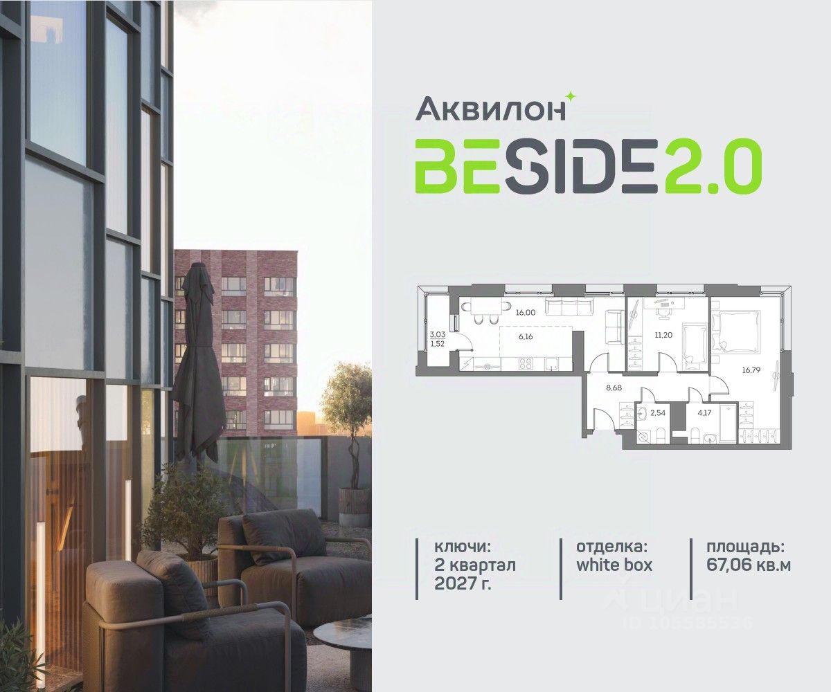 Продажа от застройщика. Продается просторная 2-комнатная квартира на 20 этаже современного жилого комплекса Beside 2.0. Вид из окон: на улицу. Срок сдачи: 2 кв. 2027 г. Квартира с лоджией. Отделка WhiteBox: - Вам не придется заниматься черновыми работами. - Возможность реализовать любой дизайн-проект. Расположение: В Beside 2.0 все необходимое - в шаговой доступности, не нужно тратить много времени на дорогу до работы, школы и поликлиники, походы в магазины и кинотеатры. Квартал расположен на пересечении ключевых транспортных магистралей Москвы, что позволяет быстро и легко добраться до любой нужной локации. Выбирайте наиболее подходящее занятие или попробуйте все! - Спортивные центры - Ретейл на первых этажах - Событийная площадь с амфитеатром - Дворовые площадки для активностей Транспортная доступность: - 5 минут на машине до ТТК - 7 минут на машине до Садового кольца - 7 минут пешком до станции "Нижегородская Внутренняя инфраструктура Beside 2.0: - Своя школа на 825 учеников - Просторное и светлое гранд-лобби - Коворкинг на открытом воздухе - Детский клуб Akvilon Kids - Подземный паркинг - Колясочные и велосипедные - Сити-боксы для хранения - Профессиональная управляющая компания Преимущества: - Технология энергоэффективности Termo-S, снижающая теплопотерю домов и позволяющую экономить на электроснабжении - Soundstop - технология дополнительной шумоизоляции на 39 дБ в квартирах с WhiteBox и чистовой отделкой - Система умного дома inHome 3.0 позволит контролировать коммунальные расходы, оплачивать счета и пользоваться услугами, не выходя из умного дома - Vent-In - система циркуляции воздуха в каждой комнате