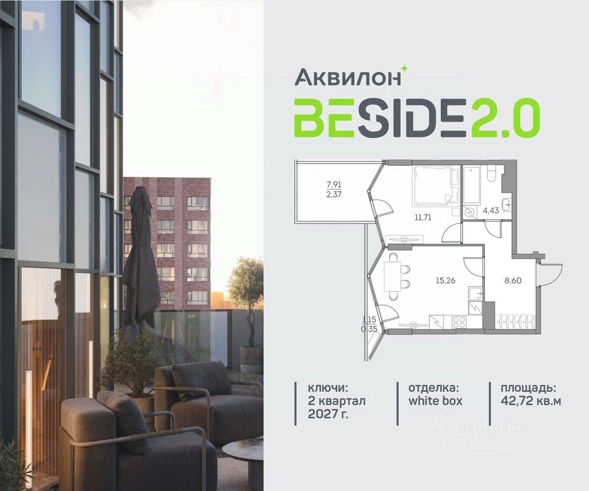Продается уютная однокомнатная квартира на 2 этаже современного жилого комплекса Beside 2.0. Вид из окон: во двор и на улицу. Срок сдачи: 2 кв. 2027 г.