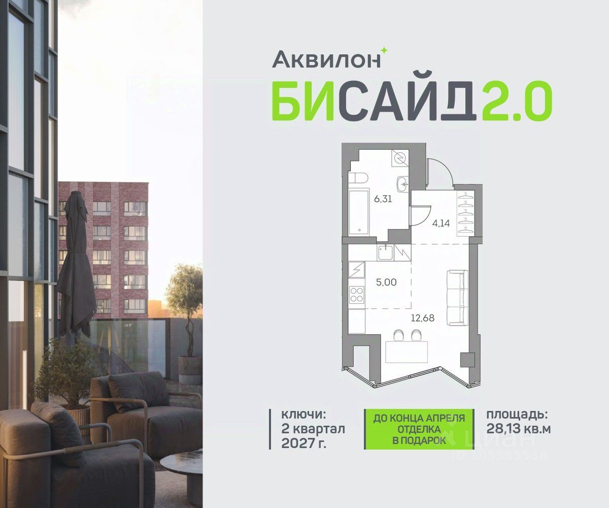 Продается просторная студия на 12 этаже современного жилого комплекса Бисайд 2.0. Вид из окон: во двор. Срок сдачи: 2 кв. 2027 г.