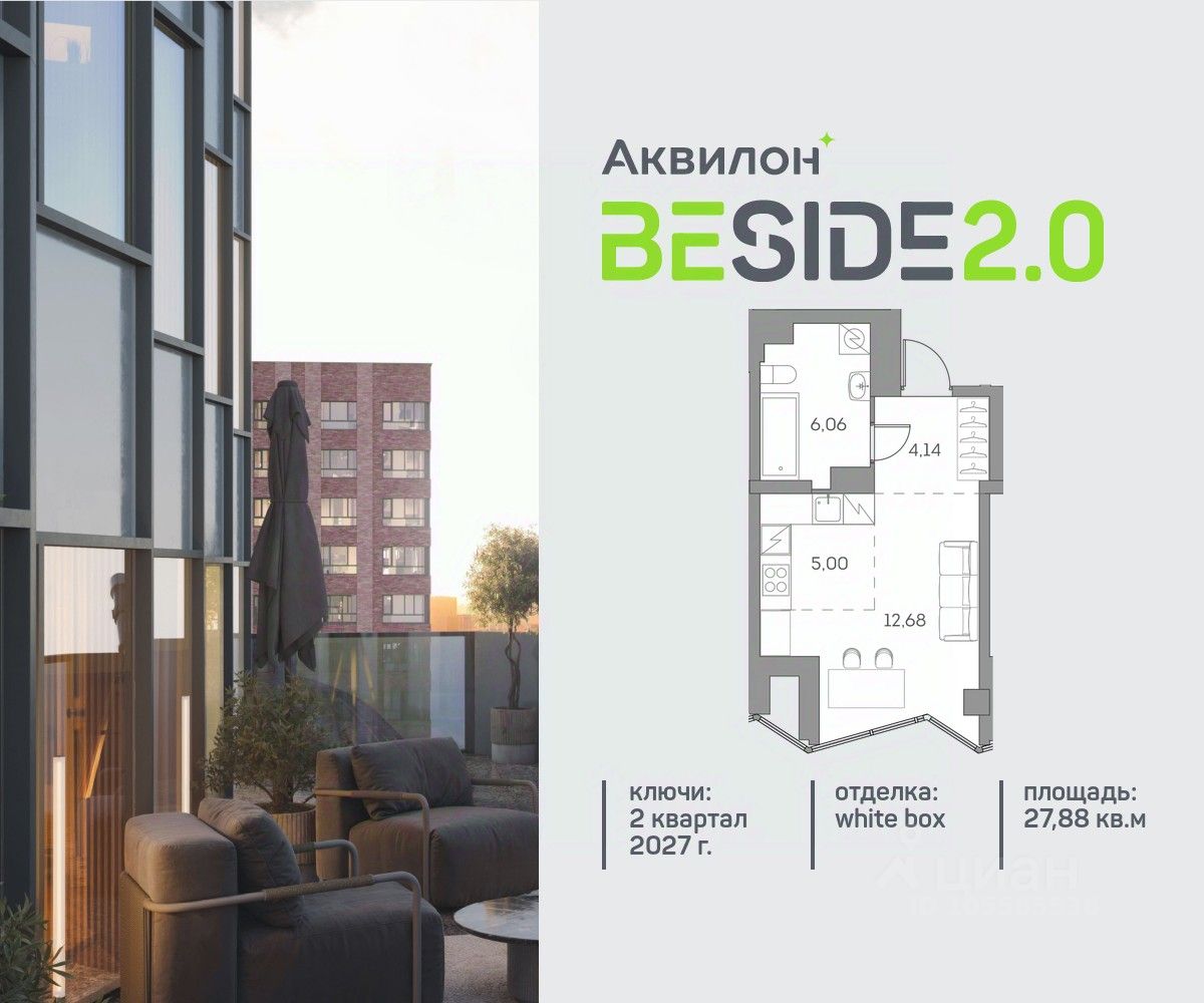 Продается просторная студия на 19 этаже современного жилого комплекса Beside 2.0. Вид из окон: во двор. Срок сдачи: 2 кв. 2027 г.