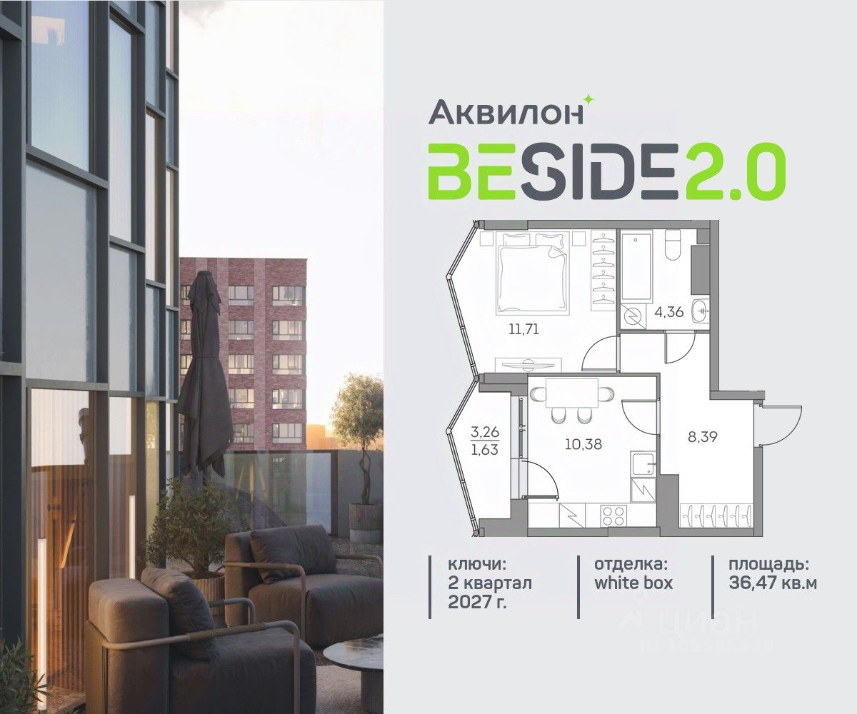 Продается уютная однокомнатная квартира на 22 этаже современного жилого комплекса Beside 2.0. Вид из окон: во двор и на улицу. Срок сдачи: 2 кв. 2027 г.
