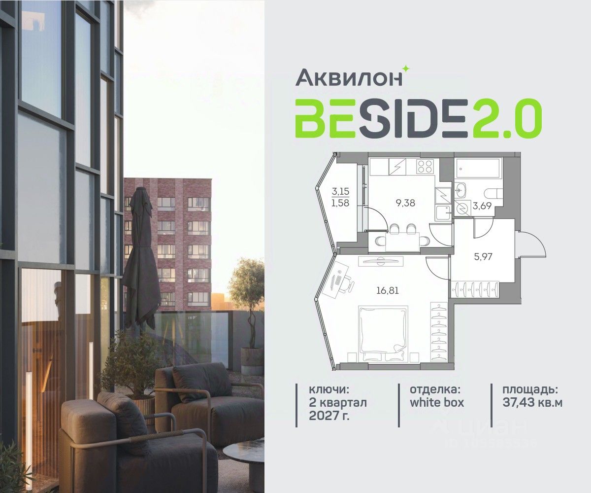 Продается уютная однокомнатная квартира на 23 этаже современного жилого комплекса Beside 2.0. Вид из окон: во двор. Срок сдачи: 2 кв. 2027 г.