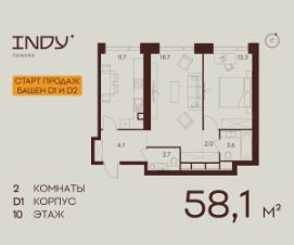 Продается 2-комнатная квартира на 10 этаже жилого комплекса Indy Towers. Срок сдачи: 3 кв. 2029 г.