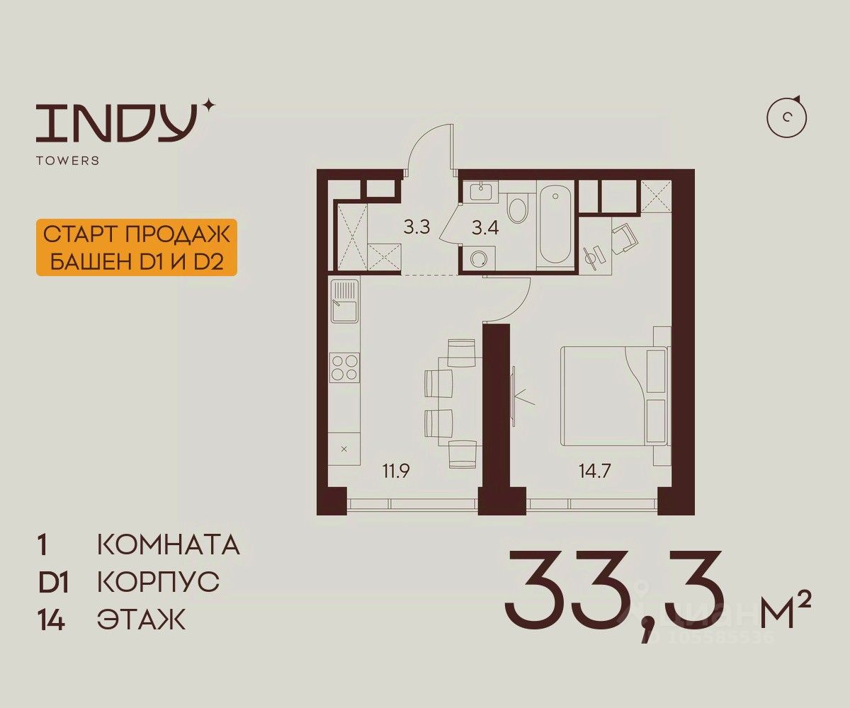 Продается уютная однокомнатная квартира на 14 этаже жилого комплекса Indy Towers. Срок сдачи: 3 кв. 2029 г.