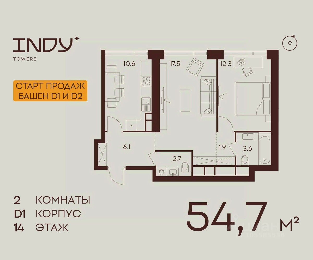 Продается 2-комнатная квартира на 14 этаже жилого комплекса Indy Towers. Срок сдачи: 3 кв. 2029 г.