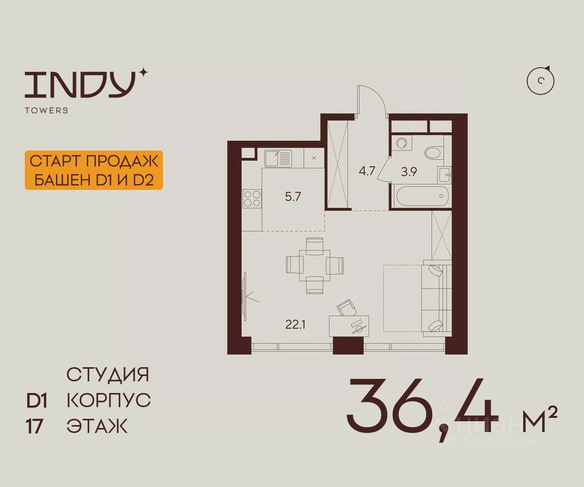 Продается просторная студия на 17 этаже жилого комплекса Indy Towers. Срок сдачи: 3 кв. 2029 г.